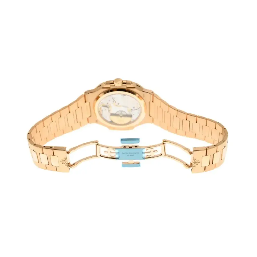 The case measures 40 mm and features a stunning rose-gold finish crafted from premium stainless steel. Paired with a perfectly matched integrated Nautilus bracelet, the watch delivers both comfort and elegance, with adjustable links and a secure clasp identical to the genuine 5712/1R-001.